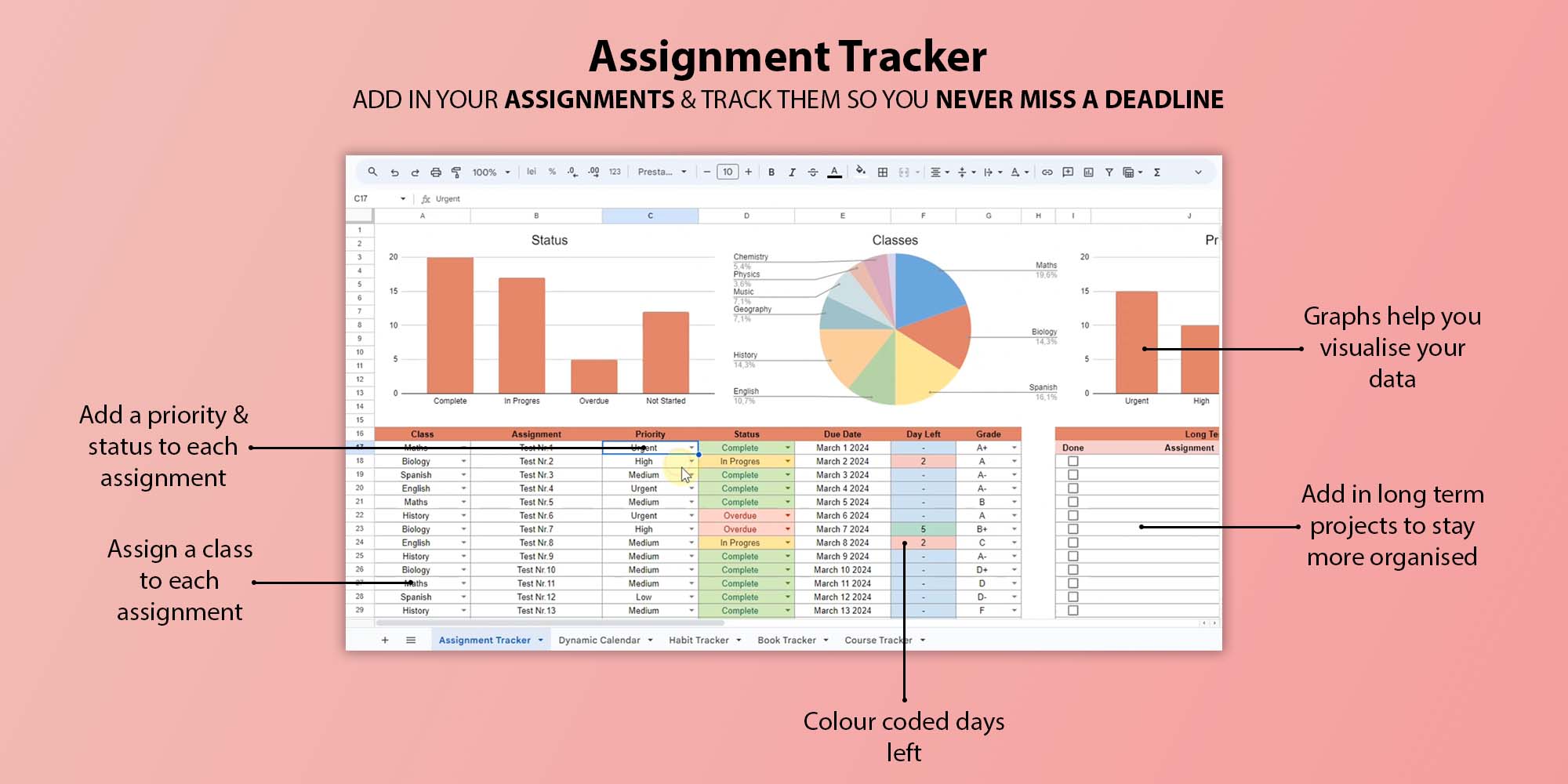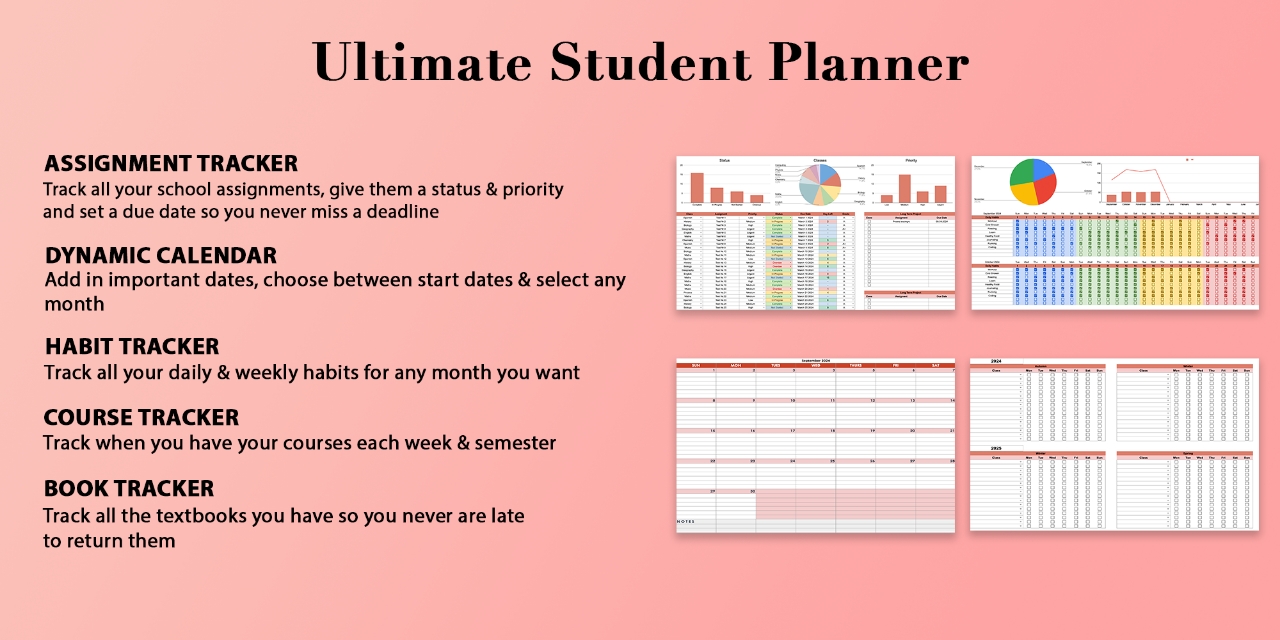 Academic Student Planner Spreadsheet, School Assignment Tracker Google Sheets, College Study Tracker Template,University Planner